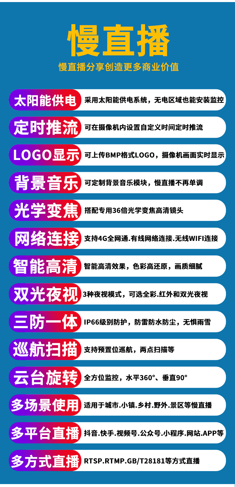 2、內置智能4G模塊,沒有寬帶網絡的地方也能實現實時慢直播; 3、不僅可以監控監管錄像,還可以實時慢直播分享創造更多商業價值; 、4、美景中國.智慧景區.城市慢直播.動物慢直播.融媒體慢直播.央視頻慢直播.戶外直播等慢直播;