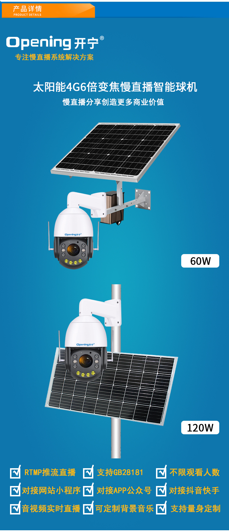 3、內置智能4G模塊,沒有寬帶網絡的地方也能實現實時監控直播;另外選配太陽能供電系統可實現無電無網實時監控直播;