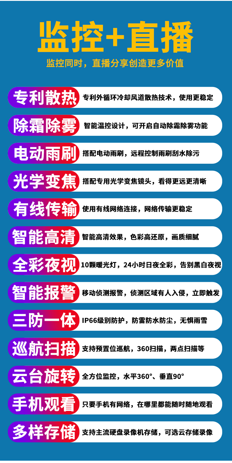 12、10顆進(jìn)口大功率高效能點(diǎn)陣暖光燈,紅外夜視1-160米;36倍/48倍變焦高清鏡頭;