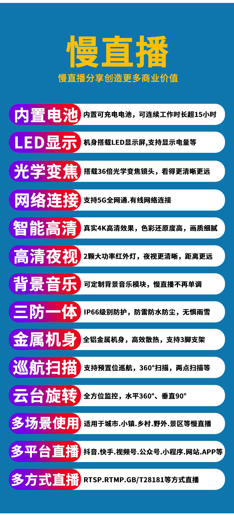 - 1、4K800萬5G紅外慢直播智能高清布控球,一個布控球就是一套完整的慢直播系統;支持360度水平及90度垂直旋轉,36倍光學變焦高清鏡頭,全金屬外觀,IP66防水等級;內置大容量鋰電池,連續工作時長超過15小時;配置便攜式牢固金屬三腳架;可滿足臨時快速搭建慢直播系統搭建需求;