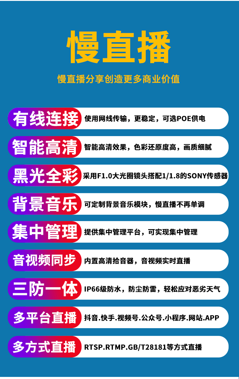 - 1、500萬極致黑光全彩慢直播高清攝像機,一個攝像機就是一套慢直播系統;